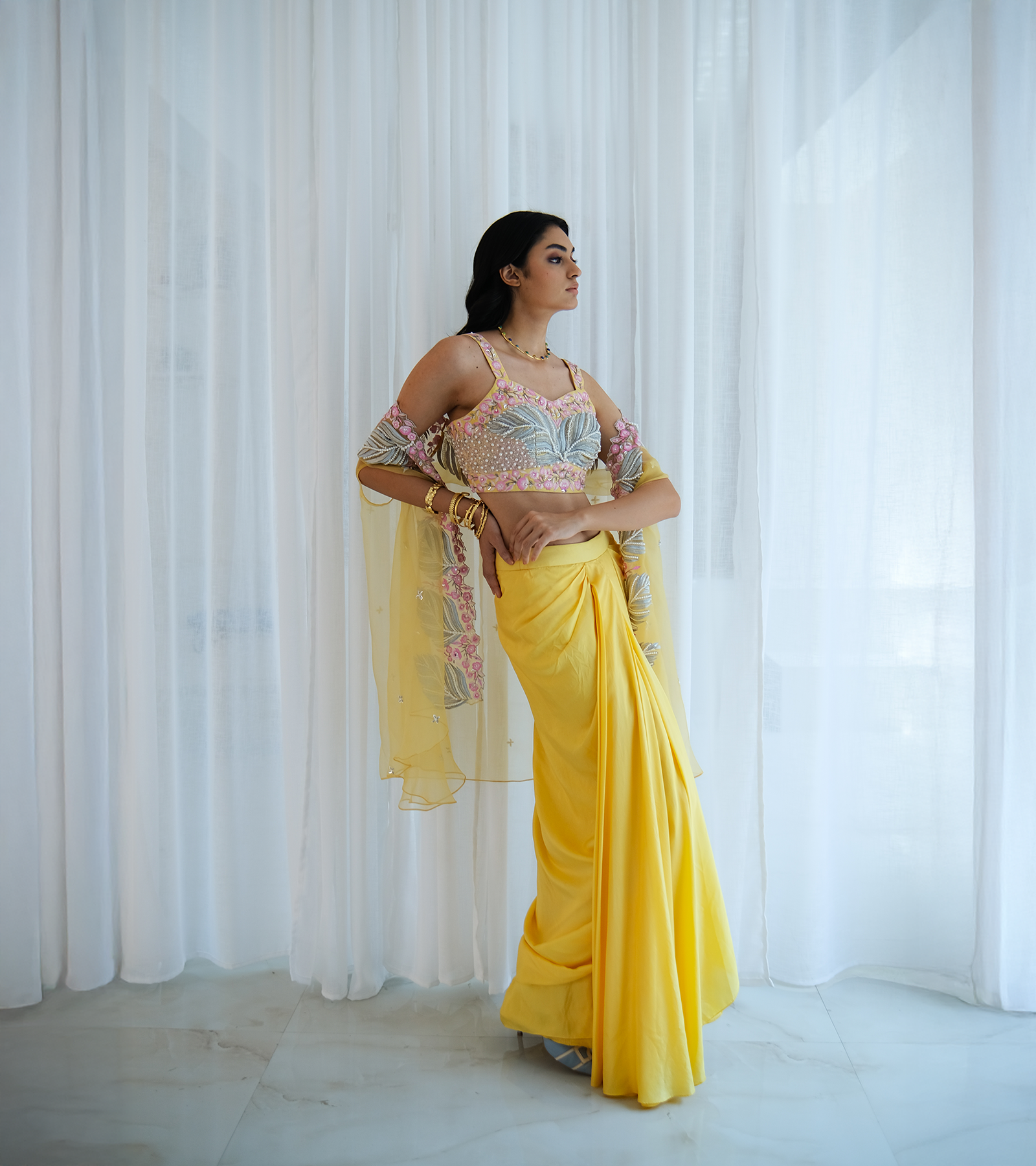 The flow of silks meets soft organza with meticulous craftmanship. The collection's signature leaf motif, rendered in delicate zari threads, adds a gentle yet bold richness to this silhouette of the cape paired with an embellished blouse and a cascading silk drape skirt.
