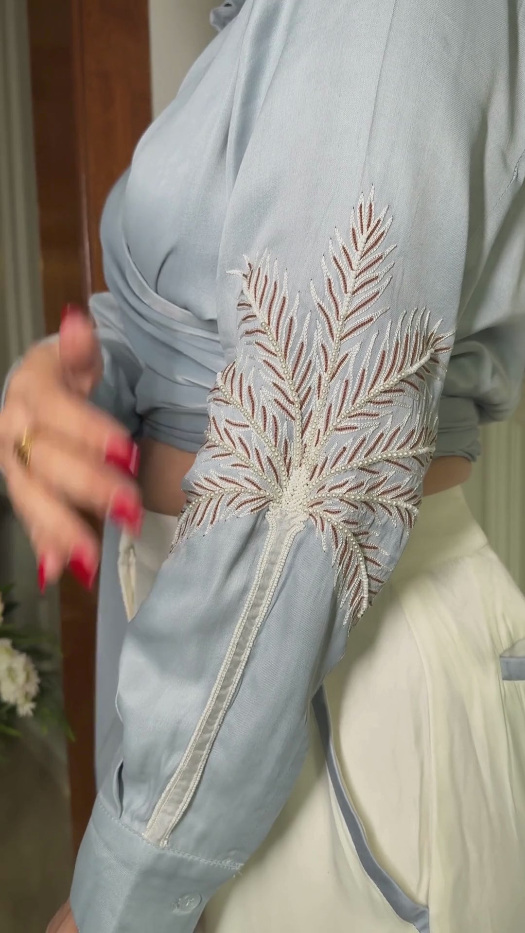 The Leela shirt and trousers set is a beachy spectacle wrapped and tied in a soft blue crop shirt and white trousrs accented with matching blue details. Crafted in a comfortable boski satin fabric the sleeves of the shirt feature a delicately hand embroidered bold palm motif in white silk thread adding the right amount of oppulence to your plans.