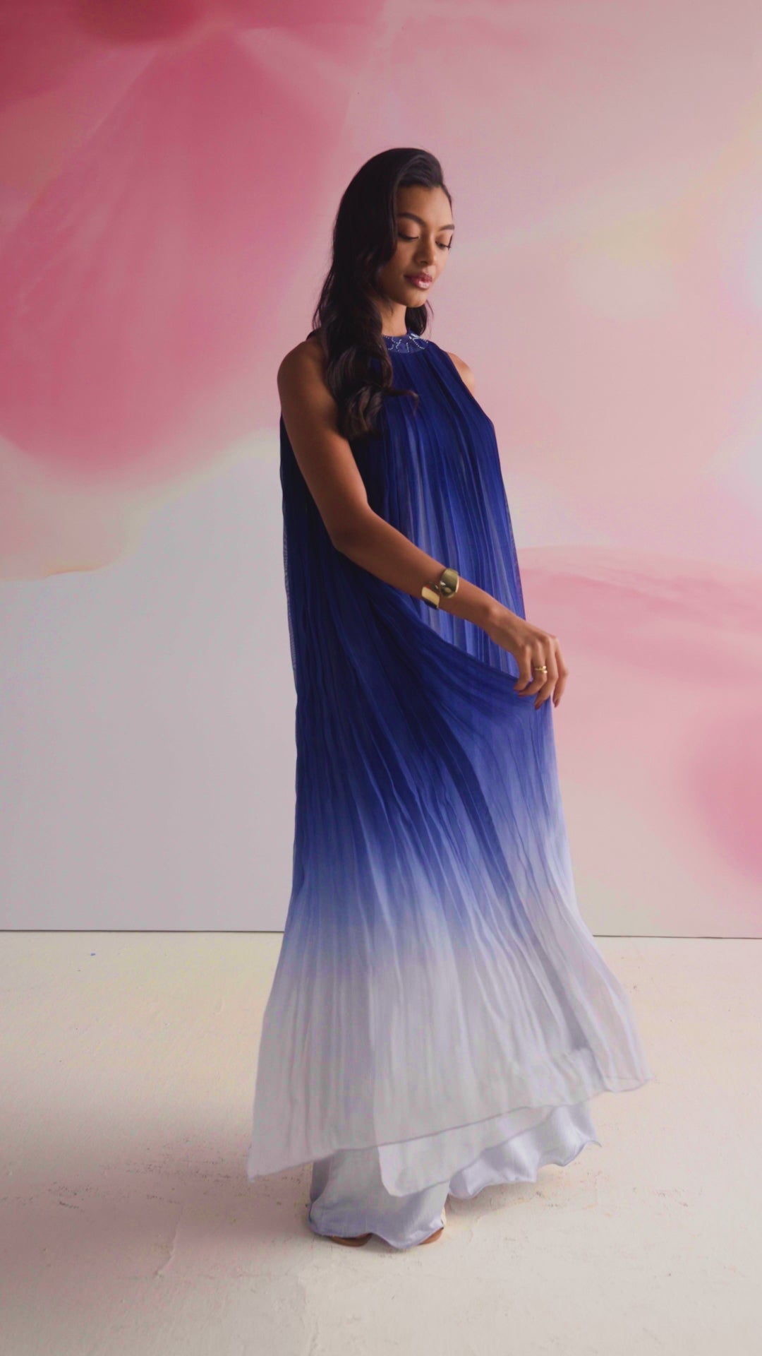 The Aurima dress flows like a twilight sky captured in soft ombré hues of deep blue fading into gentle grey. Crafted in sheer organza with a comforting linen satin lining, this halter-neck silhouette is adorned with delicate embroidery around the neckline, adding a touch of refined charm. Its fluid fall and ethereal grace make it a perfect companion for evening soirées and special gatherings.