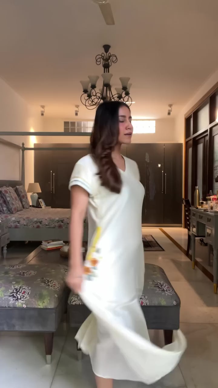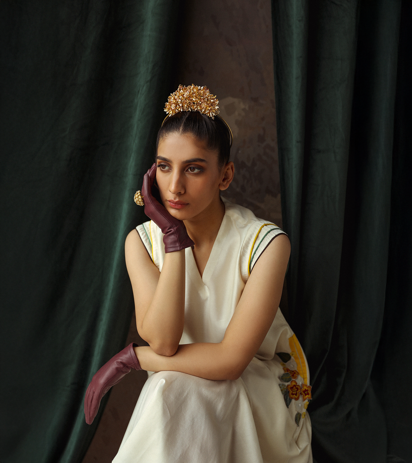 The Vani Dress is crafted in soft silk chanderi, designed in an easy flowy silhouette with an asymmetrical hem. Subtle details like the contrast piping at the sleeves and delicate hand aari embroidered floral motif at the side add an artisanal charm to this timeless piece.