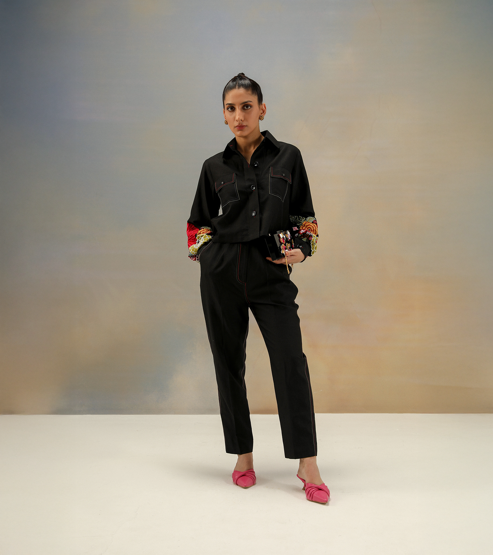 The Urvi Co-ord Set is a contemporary statement crafted in luxurious satin chanderi. The black coord is elevated with contrast stitch detailing and bold hand aari embroidered floral motifs on the sleeves, creating a striking play of texture and color. A refined silhouette that balances modern tailoring with artisanal craft.